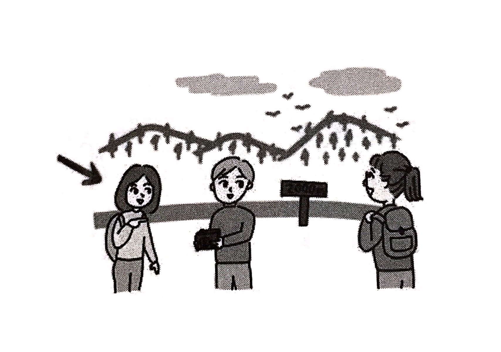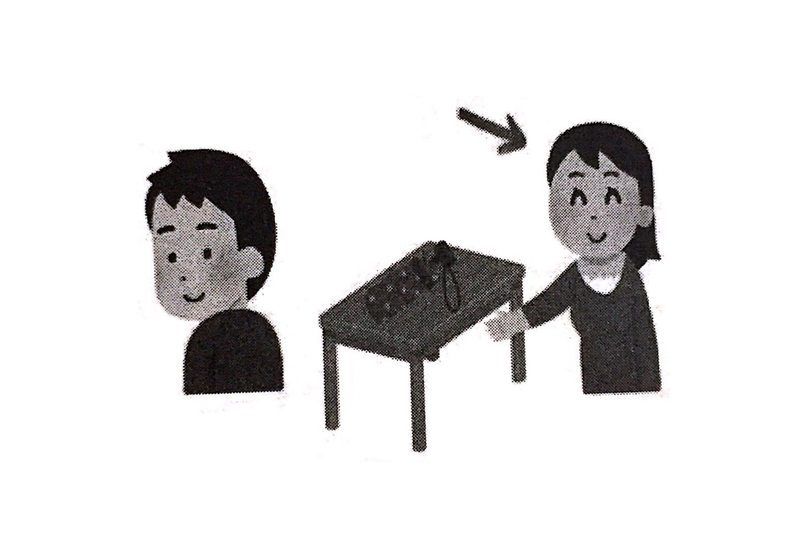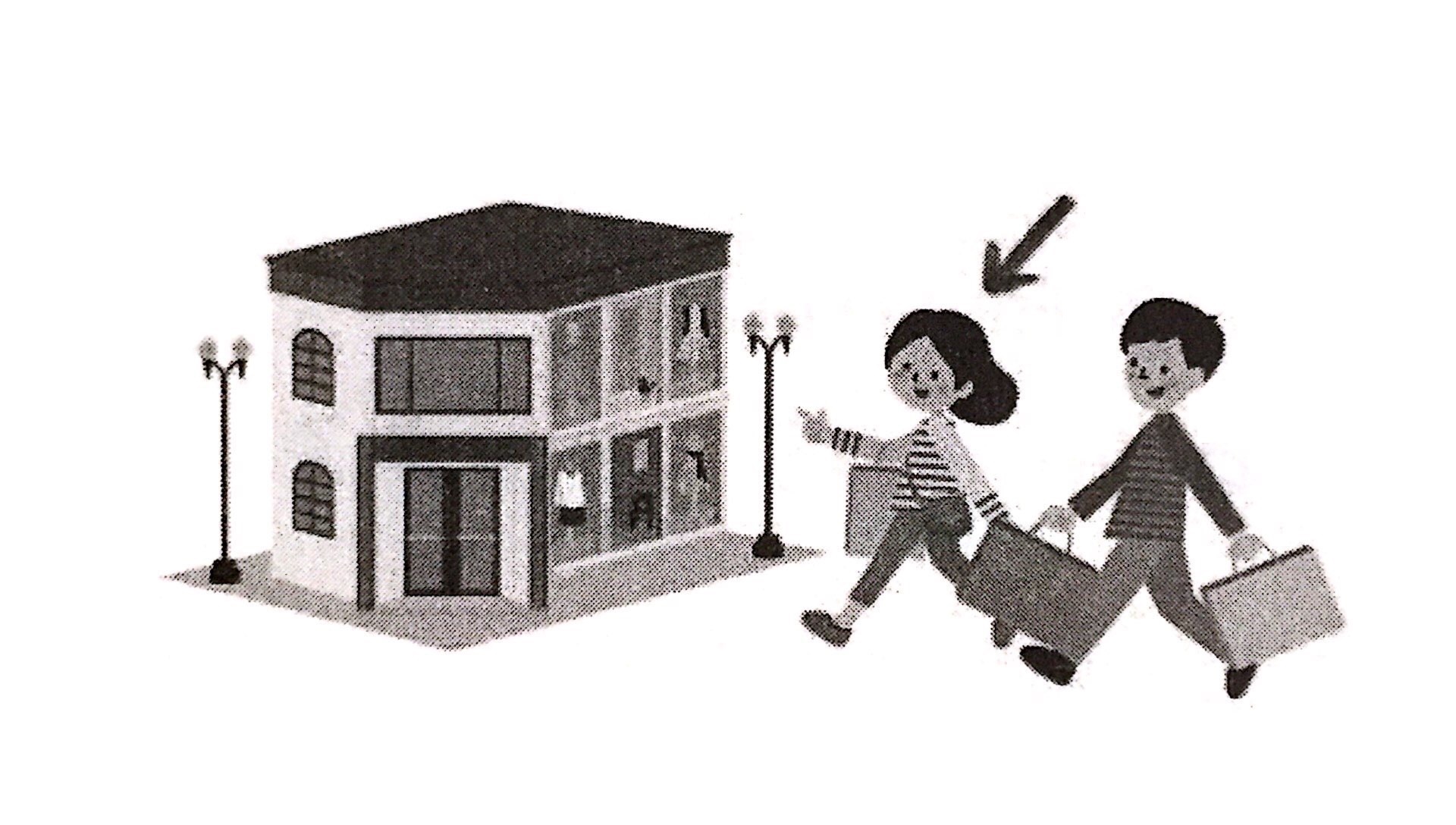 問題4では、えを見ながら質問を聞いてください。やじるし(→)の人は何と言いますか。1から3の中から、最もよいものを一つえらんでください。