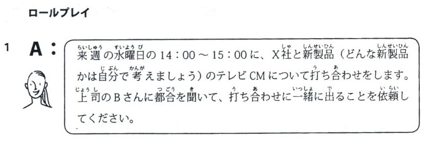 A: 来週の水曜日の14:00~15:00に、X社と新製品(どんな新製品かは自分で考えましょう)のテレビCMについて打ち合わせをします。 Vào 14:00 ~ 15:00 thứ tư tuần sau có cuộc họp về quảng cáo tivi của sản phẩm mới với công ty X (sản phẩm như thế nào bạn hãy tự nghĩ ra) 上司のBさんに都合を聞いて、打ち合わせに一緒に出ることを依頼してください。 Hãy hỏi sự thuận tiện của cấp trên B và nhờ đi cùng đến cuộc họp |