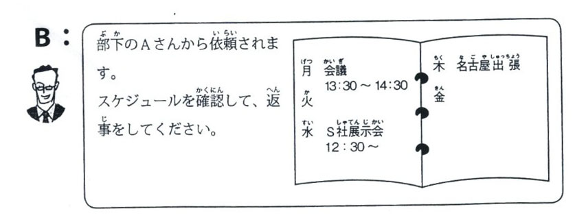 B : 部下のAさんから依頼されます。 Được nhờ vả từ cấp dưới A スケジュールを確認して、返事をしてください。 Hãy xác nhận lịch và trả lời |