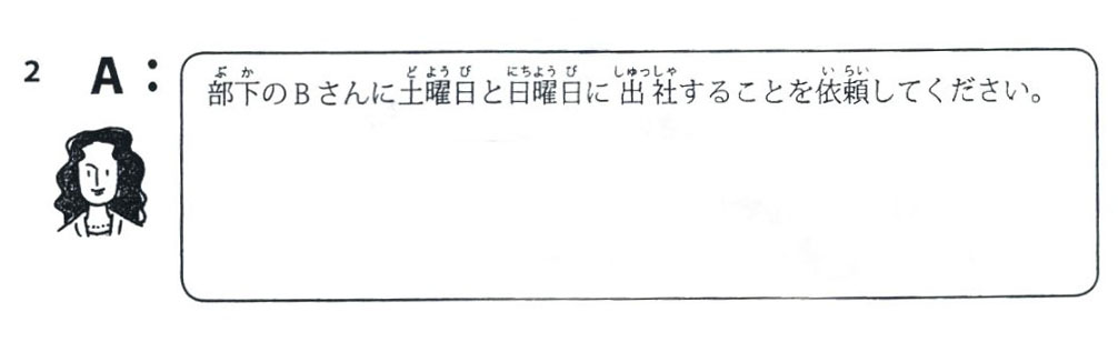 A: 部下のBさんに土曜日と日曜日に出社することを依頼してください。 Hãy nhờ vả cấp dưới B việc đi cùng vào thứ bảy và chủ nhật |