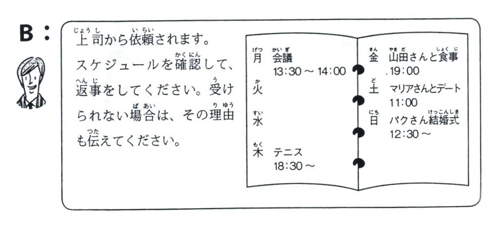 B : 上司から依頼されます。 Được nhờ vả từ cấp trên スケジュールを確認して、返事をしてください。 Hãy xác nhận lịch và trả lời 受けられない場合は、その理由も伝えてください。 Trường hợp không thể nhận được thì cũng hãy truyền đạt lý do |