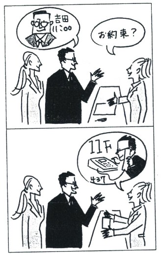 エレベーターホール右手のインターホンで437と押し頂きますと、吉田が参ります。 Khi anh nhấn 437 ở điện thoại bên phải sảnh thang máy thì anh Ishida sẽ tới. |