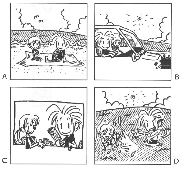 女:いい天気ですね。車で海へ行って、泳ごう。