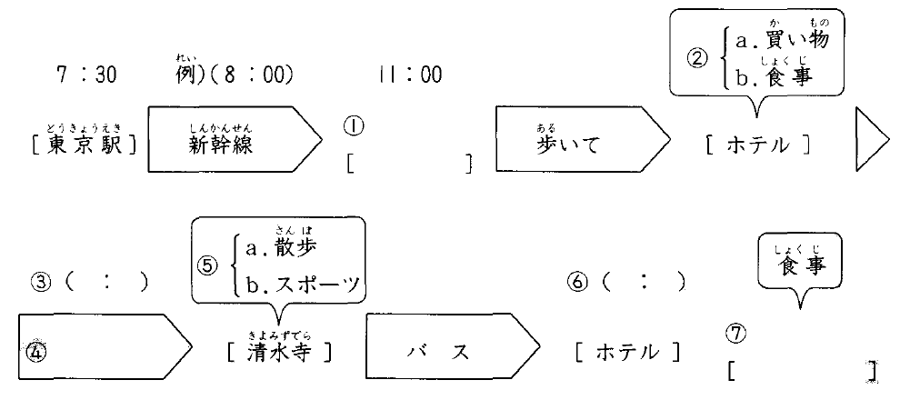 1. あした京都旅行に 行きます。何時に 何を しますか。