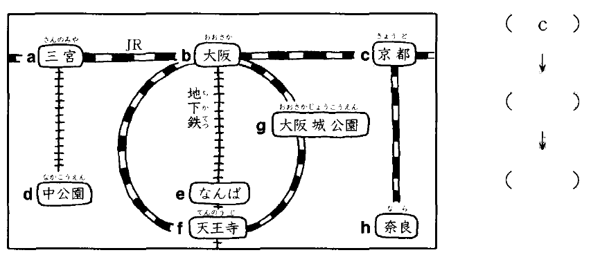 大阪で 乗り換えて、「大阪城公園」ですね。 Đổi xe ở Osaka là [công viên Osaka] nhỉ. |