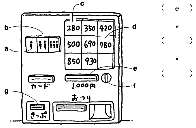 じゃ、ここに お金を 入れて、……2枚ですから、 Vậy thì, để tiền vào chỗ này,…… vì mua 2 tấm vé nên. この「2人」の ボタンを 押して、 nhấn [2 người] của nút này. それから、「780円」を 押してください。 Sau đó, hãy nhấn [780 yên]. |