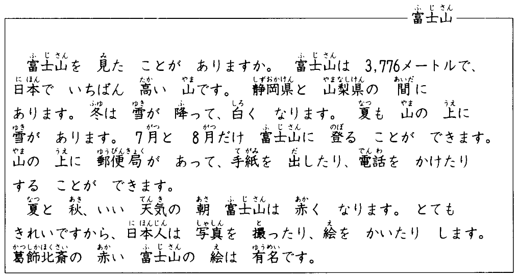 富士山を 見た ことが ありますか。 Bạn đã từng nhìn thấy núi Phú Sĩ chưa? 富士山は 3,776メートルで、日本で いちばん 高い 山です。 Núi Phú Sĩ cao 3.776 mét và là ngọn núi cao nhất Nhật Bản. 静岡県と 山梨県の 間に あります。 Nằm giữa tỉnh Shizuoka và tỉnh Yamanashi. 冬は 雪が 降って、白く なります。 Mùa đông thì có tuyết rơi và trở nên trắng xóa. 夏も 山の 上に 雪が あります。 Mùa hè trên đỉnh núi cũng có tuyết. 7月と 8月だけ 富士山に 登る ことが できます。 Chỉ có tháng 7 và tháng 8 thì có thể leo lên núi Phú Sĩ. 山の 上に 郵便局が あって、手紙を 出したり、電話を かけたり する ことが できます。 Trên đỉnh núi có bưu điện và có thể gửi thư hay cả gọi điện thoại.
