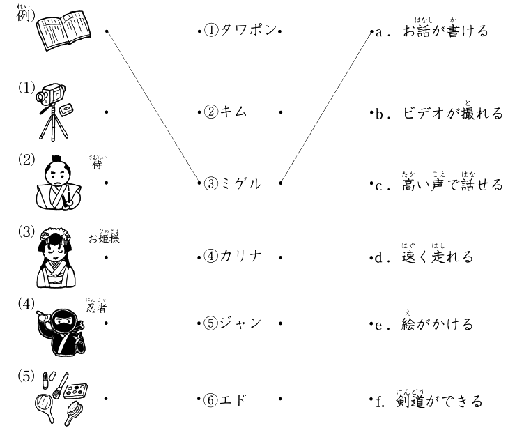 はーい、僕、侍に なりたいです。 Có, tớ, tớ muốn trở thành nhân vật Samurai. 剣道が できますから。 Vì tớ có thể chơi kiếm đạo được. |