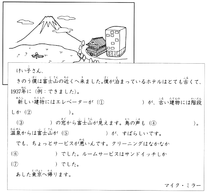 きのう 僕は 富士山の 近くへ 来ました。僕が 泊まっているホテルは とても古くて、1937年に(例:できました)。