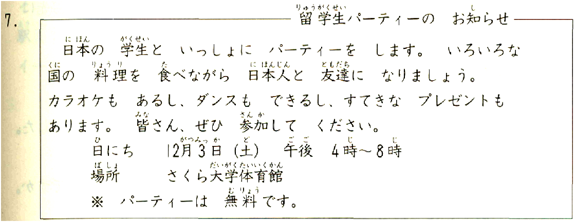 日本の 学生と いっしょに パーティーを します。 Sẽ tổ chức tiệc cùng với các học sinh Nhật Bản. いろいろな 国の 料理を 食べながら 日本人と 友達に なりましょう。 Hãy cùng nhau vừa thưởng thức món ăn các nước vừa kết bạn với người Nhật. カラオケも あるし、ダンスも できるし、すてきな プレゼントも あります。 Có cả karaoke mà cũng có thể nhảy nữa, còn có những phần quà rất tuyệt. 皆さん、ぜひ 参加して ください。 Mọi người hãy tham gia nhé!.
