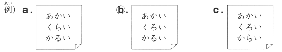 皆さん、わたしが 今から言う とおりに、書いて ください。 Chào mọi người, hãy ghi theo như tôi nói bây giờ nhé. 「赤い、黒い、軽い」 [Màu đỏ, màu đen, nhẹ]. 「赤い、黒い、軽い」。 [Màu đỏ, màu đen, nhẹ]. |