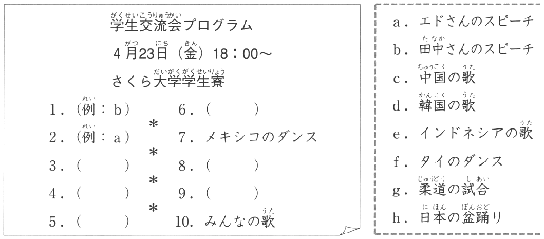 来週の「学生交流会」の プログラムを 決めましょう。 Hãy quyết định chương trình [Buổi giao lưu học sinh] vào tuần sau. |