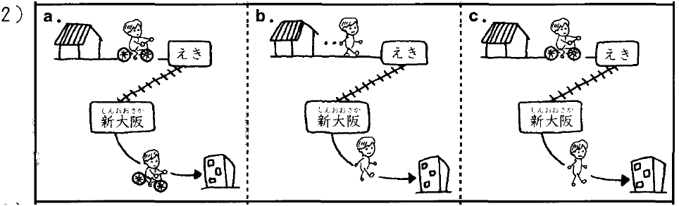駅まで 自転車で 行きます。 Đi đến nhà ga bằng xe đạp. 地下鉄で 新大阪まで 行きます。 Đi đến Shinosaka bằng tàu điện ngầm. 新大阪から 会社まで 歩いて、 Từ Shinosaka đi bộ đến công ty. うーん、20分ですね。 Um…, mất 20 phút nhỉ. |