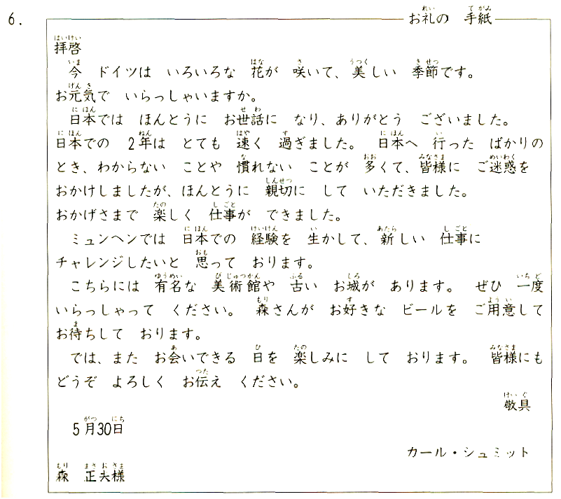 1)(____) これは シュミットさんが 日本(にっぽん)で ()いた 手紙(てがみ)です。