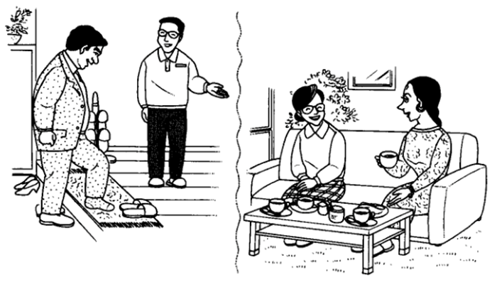 どうぞ お上がり ください。 Xin mời anh vào. |