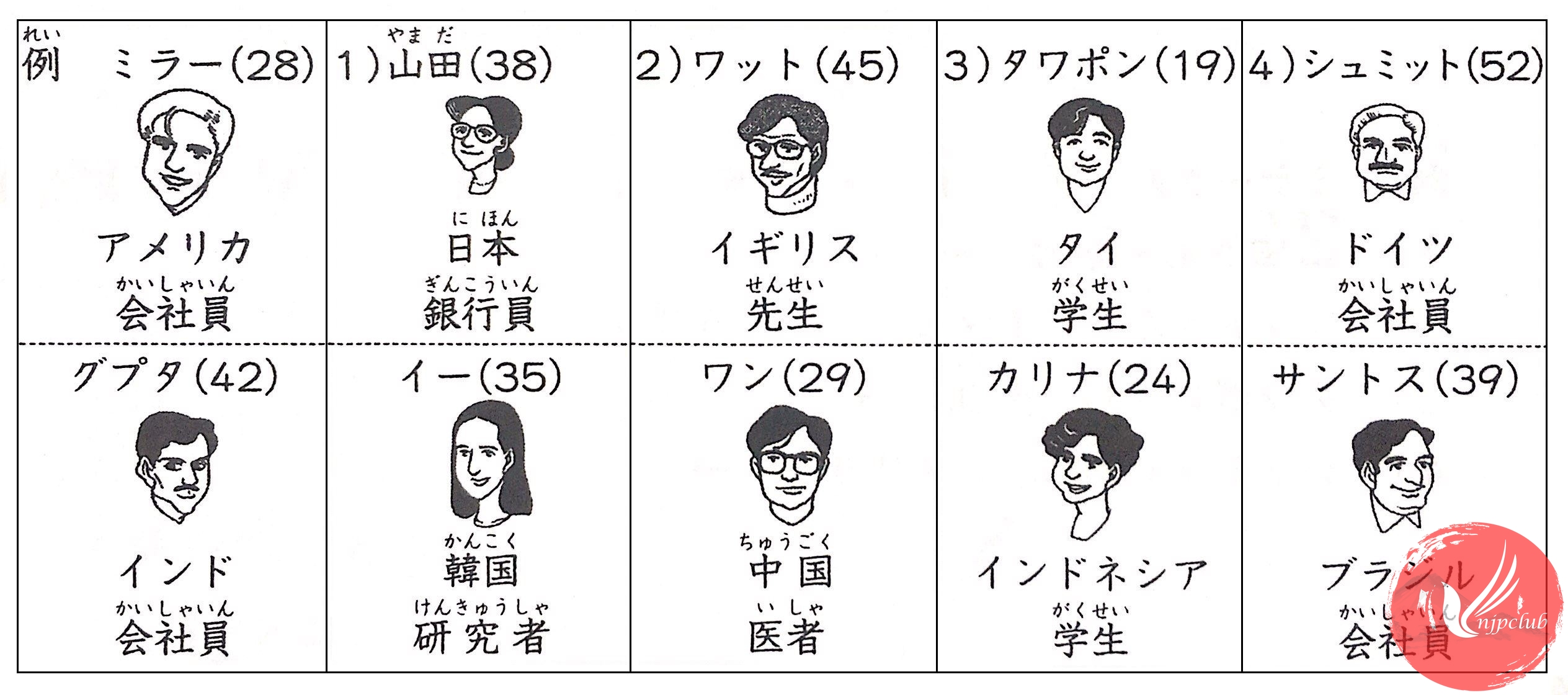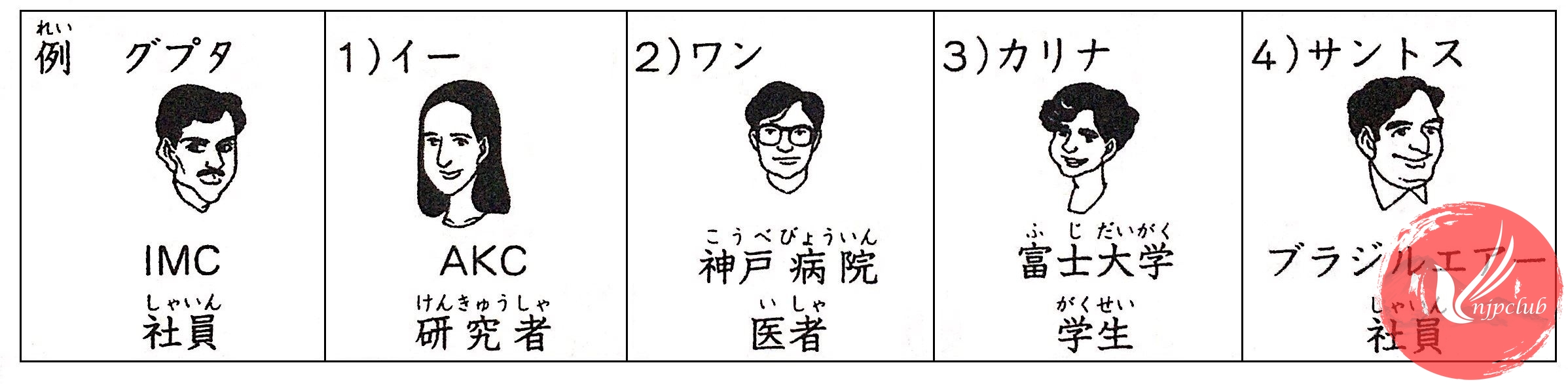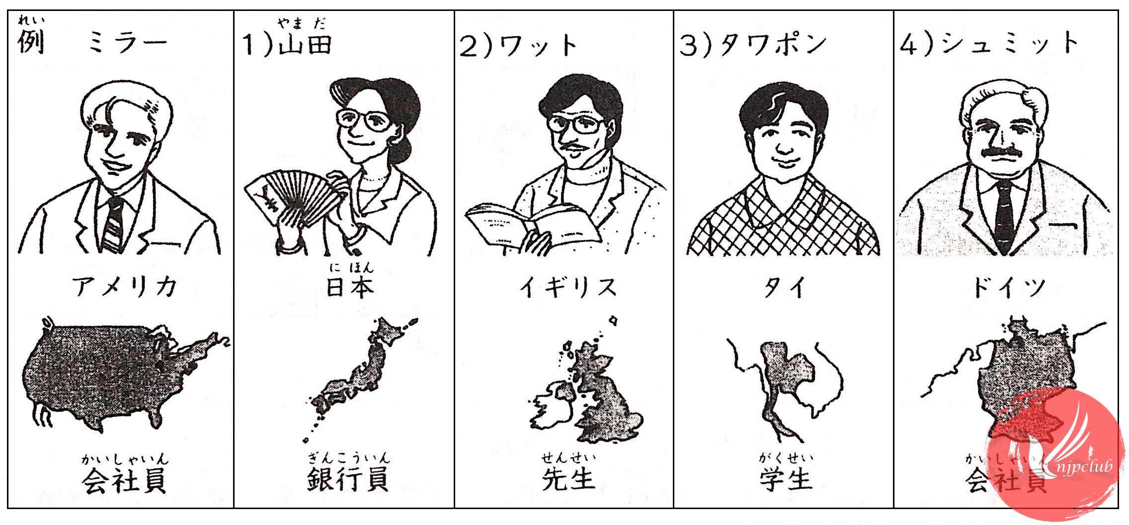 1)やまださん・ぎんこういん ⇒ 2)ワットさん・かいしゃいん ⇒ 3)タワポンさん・せんせい ⇒ 4)シュミットさん・ドイツじん ⇒