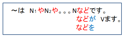 Đối với N cuối cùng chúng ta không dùng や mà dùng などđể kết thúc. など đứng trước các trợ từ thích hợp, tương ứng với các động từ ở cuối câu.