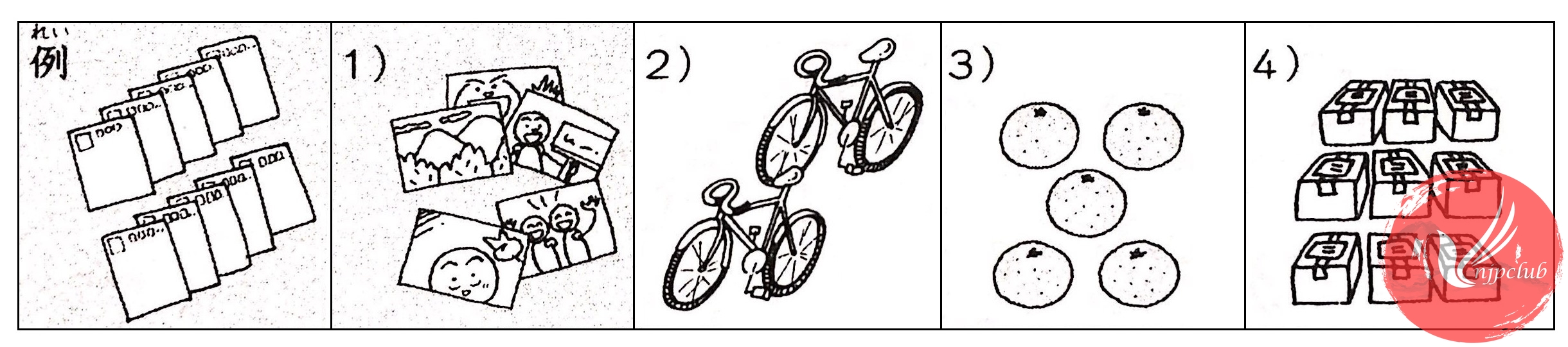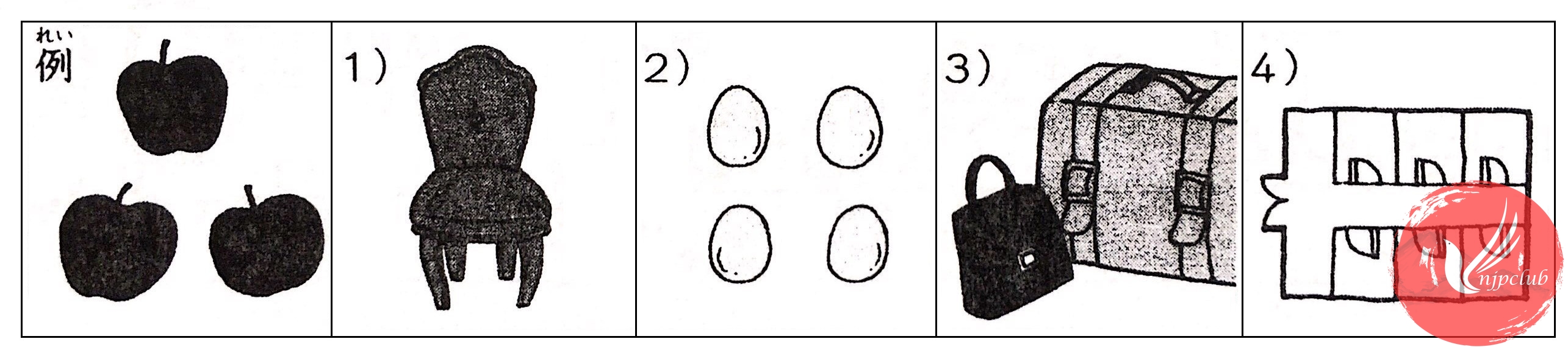 1)いす⇒ 2)卵⇒ 3)かばん⇒ 4)部屋⇒