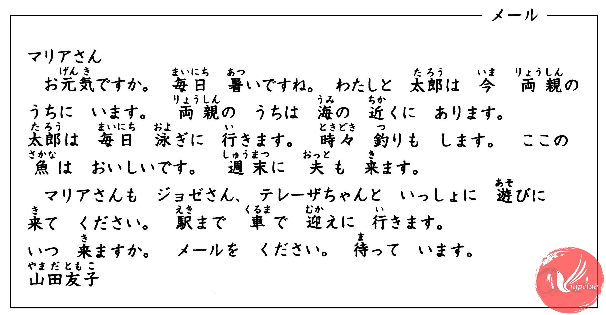 マリアさん Chị Maria お元気ですか。 Chị có khỏe không? 毎日 暑いですね。 Mỗi ngày đều nóng nhỉ. わたしと 太郎は 今 両親の うちに います。 Tôi và Taro bây giờ đang ở nhà ba mẹ. 両親の うちは 海の 近くに あります。 Nhà ba mẹ ở gần biển. 太郎は 毎日 泳ぎに 行きます。 Bé Taro mỗi ngày đều đi bơi. 時々 釣りも します。 Đôi khi cũng đi câu cá. ここの 魚は おいしいです。 Cá ở đây ngon lắm. 週末に 夫も 来ます。 Cuối tuần chồng tôi cũng sẽ đến.