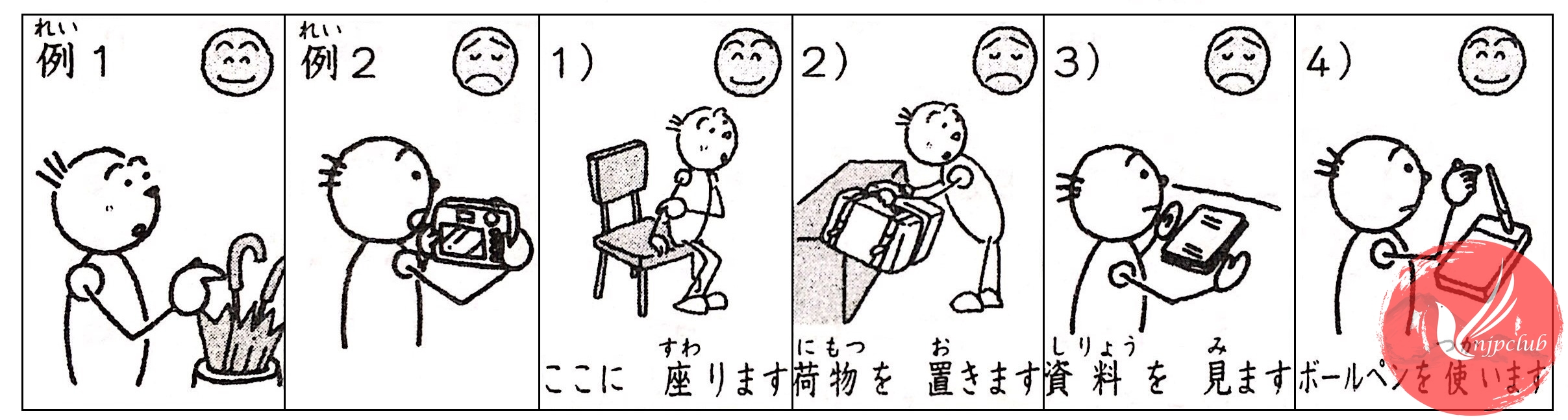 Những động từ được dùng: Nに~ はいります vào trong N すわります ngồi lên N のります lên N(xe tàu) のぼります leo N(núi) つきます đến N |