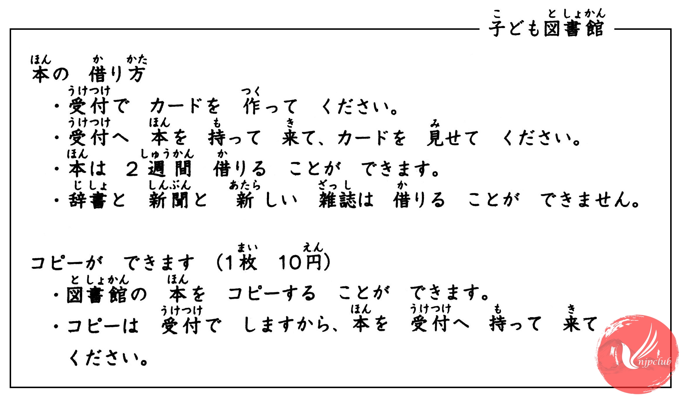 ・受付へ 本を 持って 来て、 カードを 見せて ください。 Hãy mang sách đến quầy tiếp tân và cho xem thẻ.