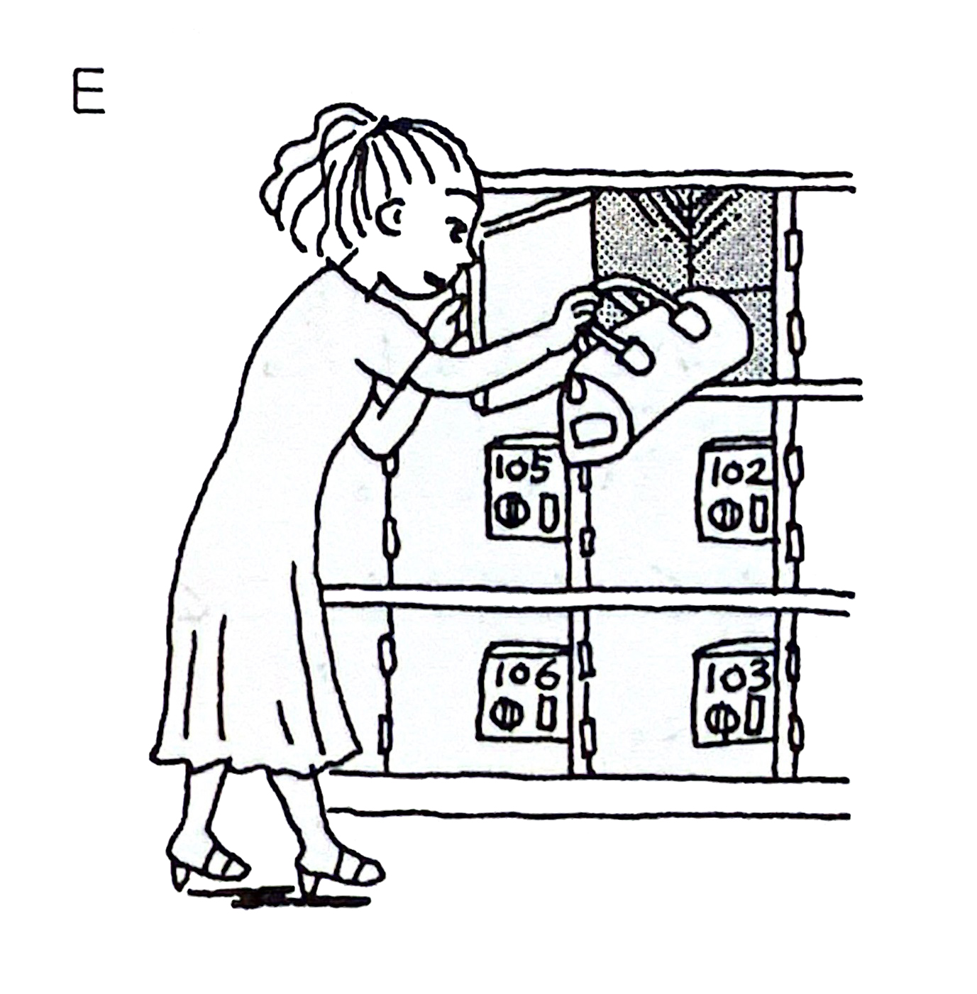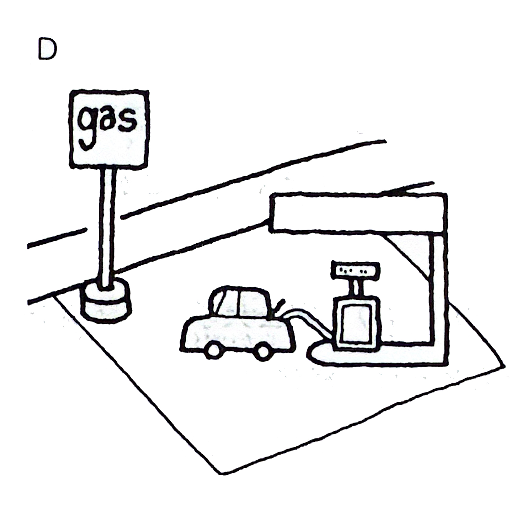 かたかなの 言葉は 英語から 来た 言葉が 多いです。 日本で 作った かたかなの 言葉も たくさん ありますが、英語では ありません。 ですから、英語が わかる 外国人も 意味が わかりません。 あなたは 下のから かたかなの 言葉が わかりますか。 1.ガソリンを 入れたいです。近くに ガソリンスタンドがありますか。 2.日本の 車は ハンドルが 右に あります。 3.この 荷物は 重いですから、荷物を コインロッカーに入れてから、買い物しましょう。 4.「テレビの リモコンは?」 ………「その いすの 上に ありますよ。」 5. 誕生日に 父に オートバイを 買って もらいました。 16歳に なりましたから、乗る ことが できます。 6.「この 部屋に コンセントが ありますか。」 ………「ええ、あのソファの 右に ありますよ。」___の かたかなの ことばは 右の 絵の 中の どれですか。
