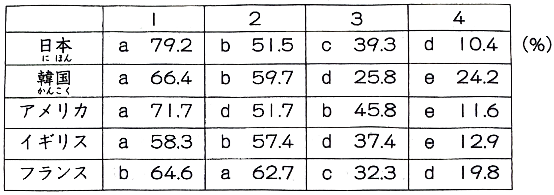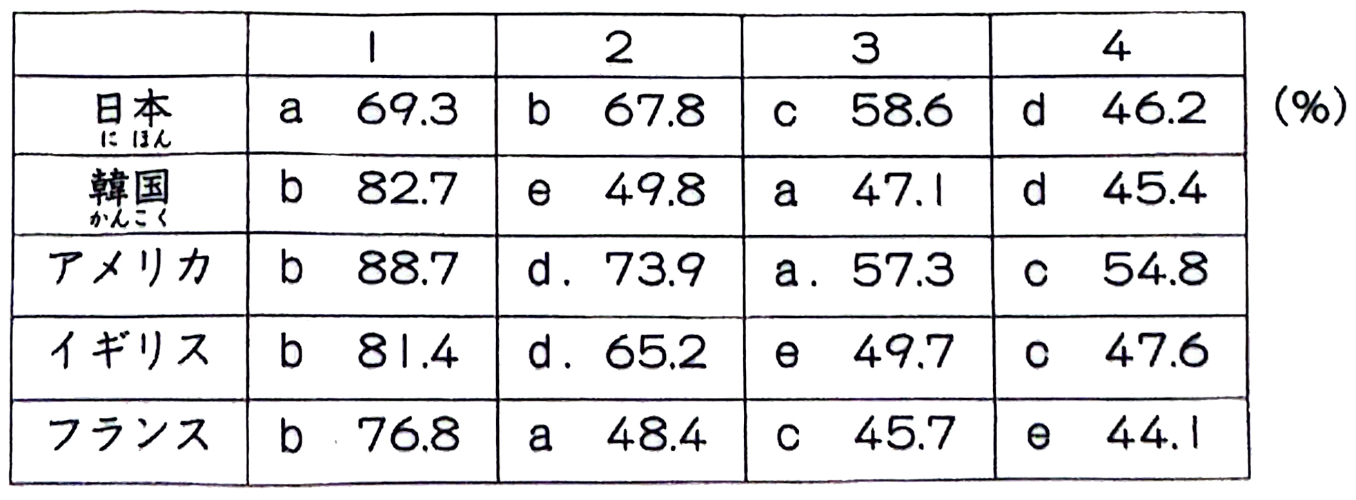 ☆ 「仕事の 内容」が 大切だと 思って いる 人が 多い 国は ( )です。韓国、アメリカ、イギリス、フランスは( )が 大切だと 思って いる 人が 多いです。