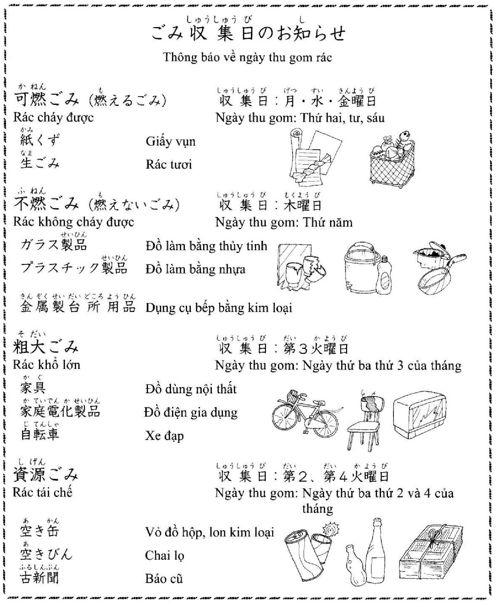 Từ vựng mở rộng về phân loại rác và ngày thu gom: 可燃ごみ, 不燃ごみ, 資源ごみ, 粗大ごみ… giúp đọc thông báo đổ rác và sống đúng quy định ở Nhật.