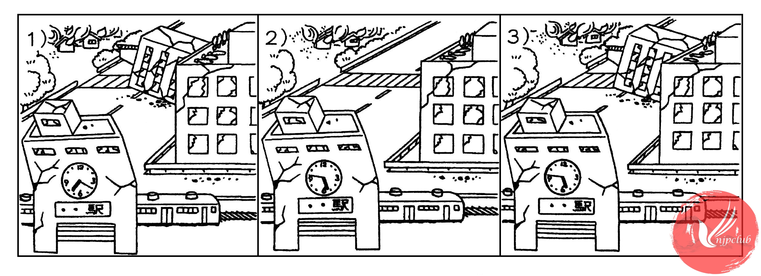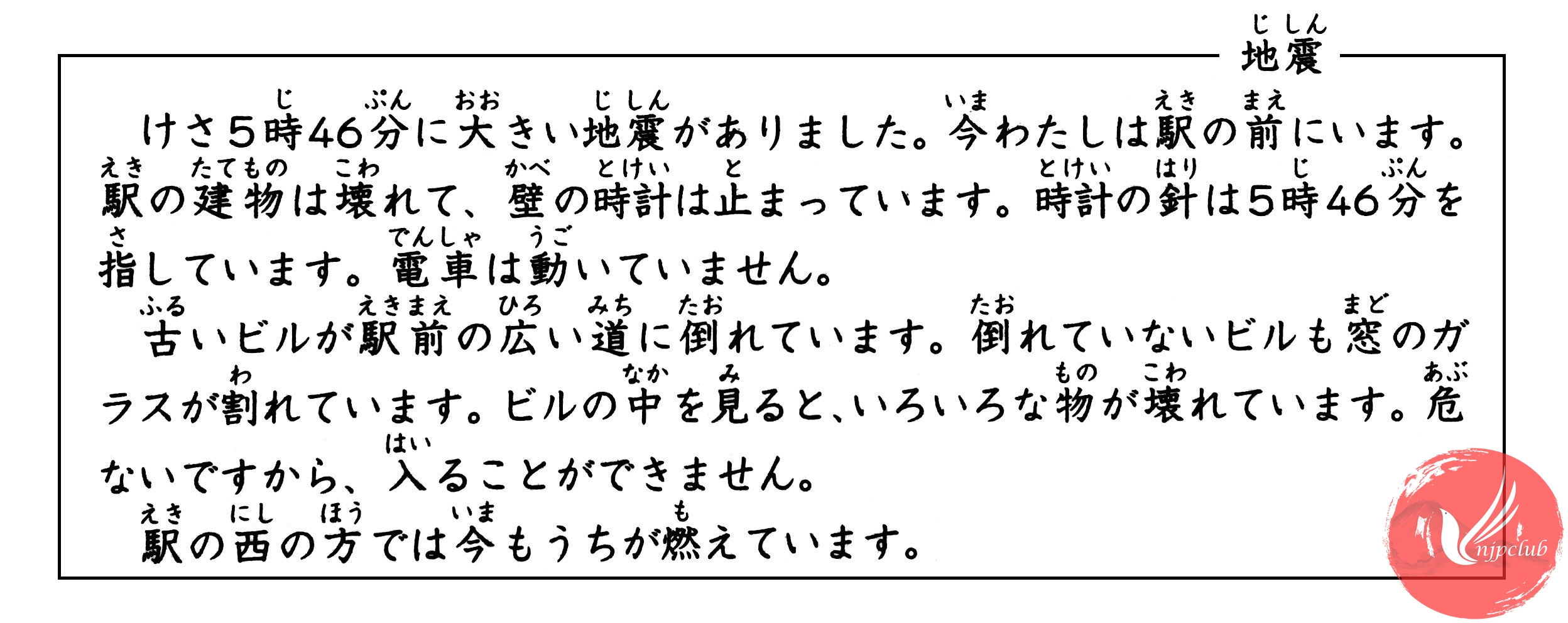 けさ 5時46分で 大きい 地震が ありました。 Sáng nay đã có trận động đất lớn vào lúc 5 giờ 46 phút. 今 わたしは 駅の 前に います。 Bây giờ tôi đang ở trước nhà ga. 駅の 建物は 壊れて、壁の 時計は 止まって います。 Tòa nhà của nhà ga bị phá hủy và đồng hồ trên tường đã dừng lại. 時計の 針は 5時46分を 指して います。 Kim đồng hồ chỉ 5 giờ 46 phút. 電車も 動いて いません。 Xe điện cũng đang không hoạt động.