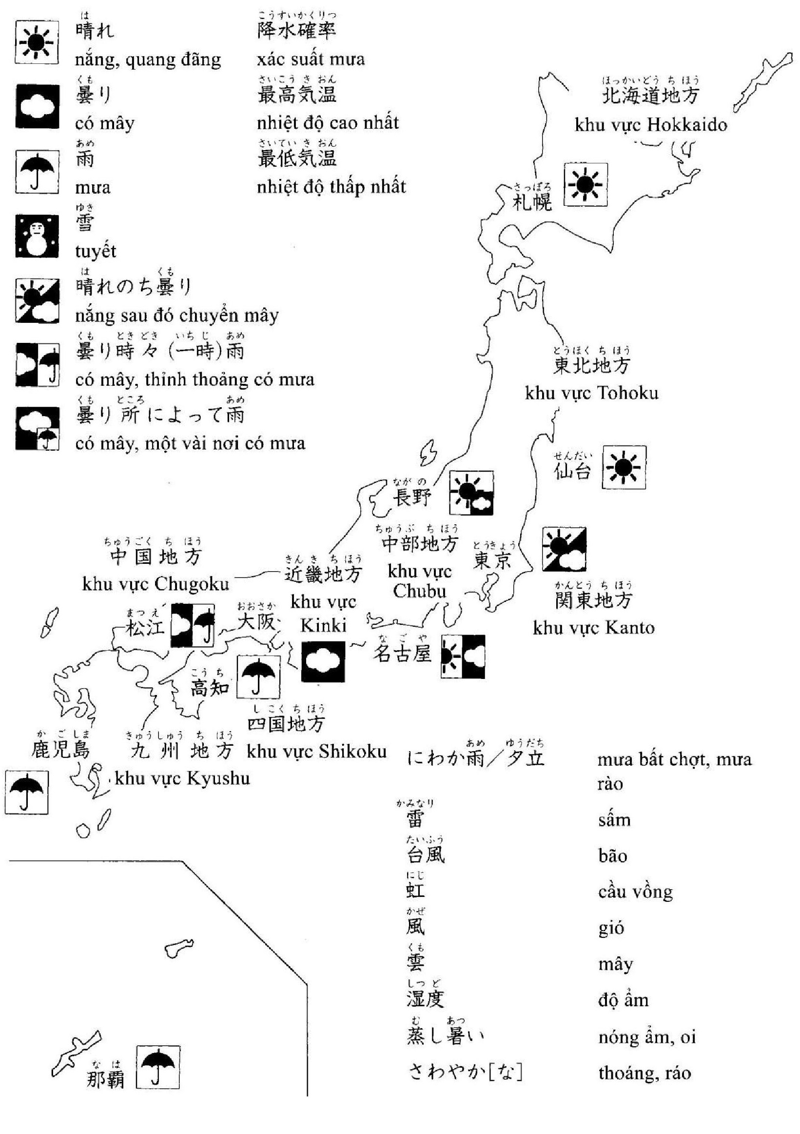 Từ vựng mở rộng về thời tiết và dự báo: 晴れ, 曇り, 雨, 雪, 湿度, 蒸し暑い, 台風, 降水確率… giúp nghe và hiểu bản tin thời tiết của Nhật.