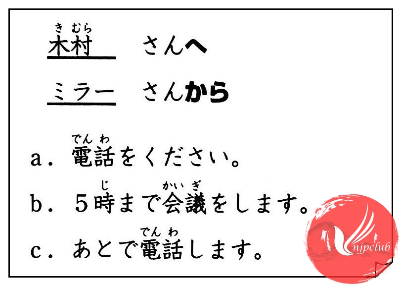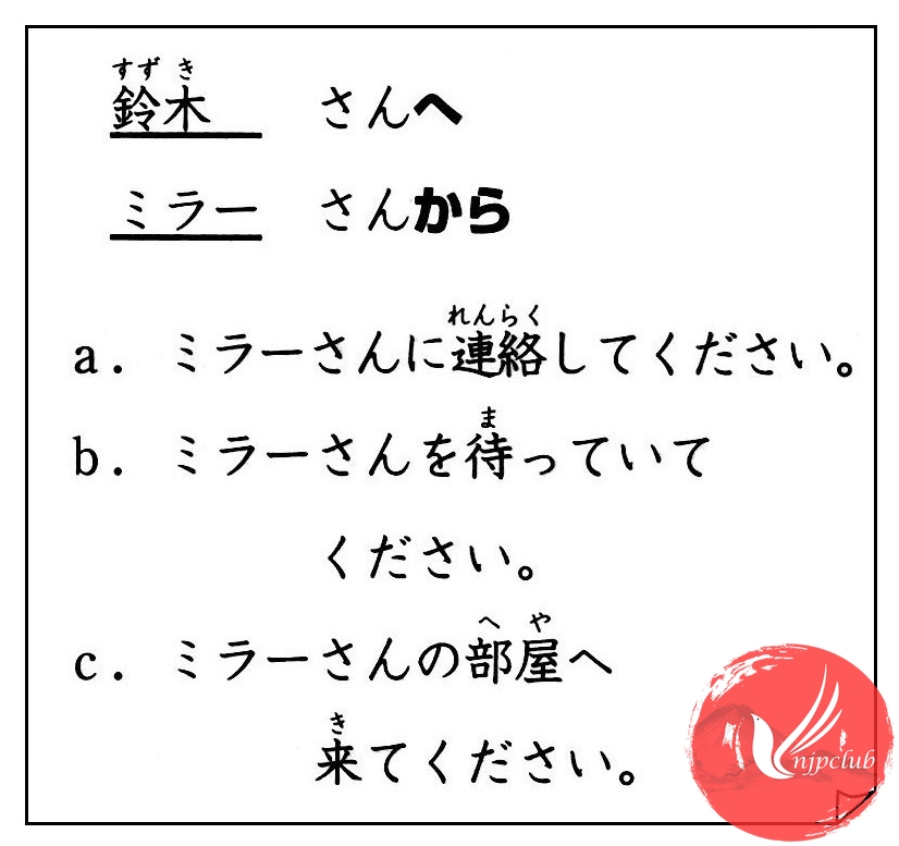これは「ごふざいれんらくひょう」と読むの。 Cái này đọc là [Gofuzai renrakuhyo] (phiếu liên lạc khi vắng mặt). ケリーさんが いないときに 荷物を 持って来たから、ここに 連絡して くださいと いう意味よ。 Có nghĩa là nếu đem hành lý đến khi không có mặt bạn Kelly thì hãy liên lạc vào chỗ này. |