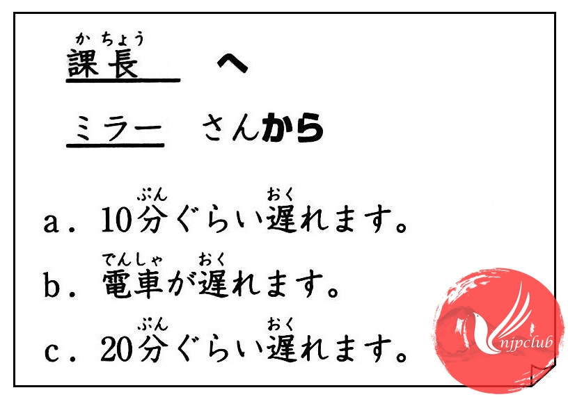 あのう、ミラーですが、電車が 遅れて いるんです。 Um.. . Tôi là Miller. Tôi bị trễ chuyến xe điện. すみませんが、課長に 少しと 伝えて いただけませんか。 Xin lỗi, làm ơn truyền đạt lại với phó phòng là tôi sẽ đến trễ một chút được không ạ? |
