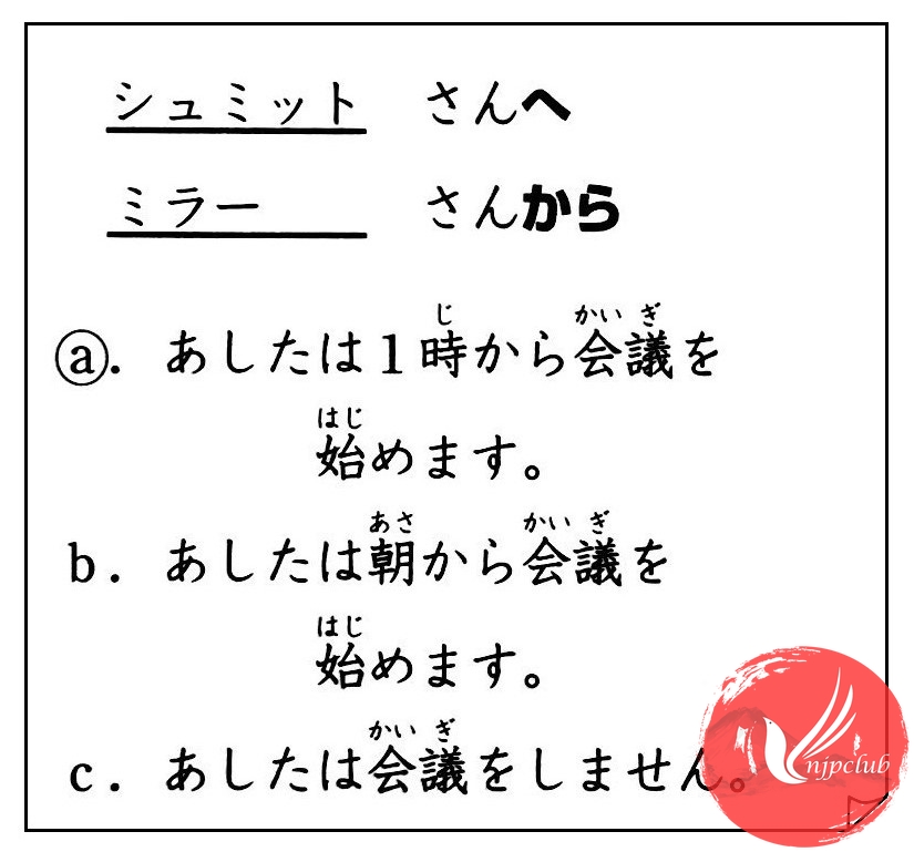 じゃ、すみませんが、 Vậy thì, xin lỗi. あしたの 会議ですが、朝は しない、午後1時から 始めると 伝えて いただけませんか。 làm ơn truyền đạt lại giùm tôi là cuộc họp ngày mai buổi sáng không thực hiện, sẽ bắt đầu từ 1 giờ chiều. |