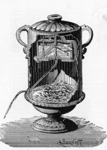 Là máy bán nước tự động, bỏ tiền vào thì cửa thoát nước sẽ mở tương ứng vớ khối lượng đồng tiền, rồi nước sẽ chảy ra.