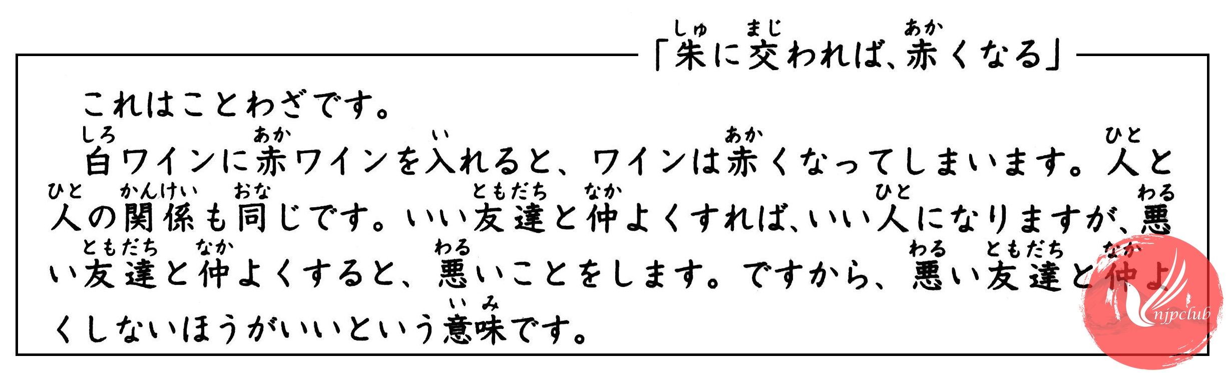 白ワインに 赤ワインを 入れると、ワインは 赤く なって しまいます。 Nếu bỏ rượu trắng và rượu đỏ vào thì rượu sẽ trở thành màu đỏ. 人と 人の 関係も 同じです。 Mối quan hệ giữa người với người cũng vậy. いい 友達と 仲よく すれば、いい 人に なりますが、悪い 友達と 仲よく すると、悪い ことを します。 Nếu thân với bạn tốt thì sẽ thành người tốt, nhưng nếu thân với bạn xấu thì sẽ làm việc xấu. ですから、悪い 友達と 仲よく しない ほうが いいと いう 意味です。 Vì vậy, có nghĩa là không nên thân với bạn xấu. |