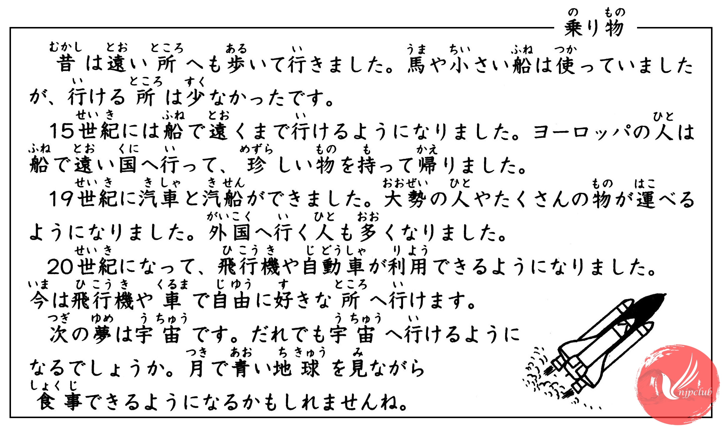 昔は 遠い 所へも 歩いて 行きました。 Ngày xưa ngay cả đến những nơi xa xôi cũng đi bộ. 馬や 小さい 船は 使って いましたが、行ける 所は 少なかった。 Ngựa hay những con thuyền nhỏ cũng đã có dùng nhưng những nơi có thể đến ít và thế giới biết được cũng rất nhỏ hẹp.