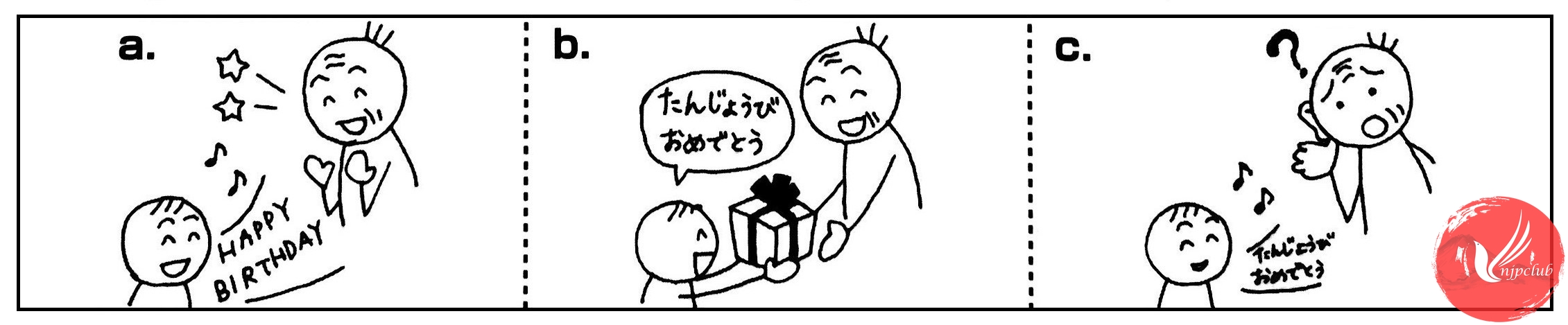 おじいちゃん、お誕生日 おめでとう。 Ông ơi, cháu chúc mừng sinh nhật ông. 僕、お誕生日の 歌、英語で 歌えるよ。 Cháu, có thể háy bằng tiếng Anh bài hát chúc mừng sinh nhật ấy. |