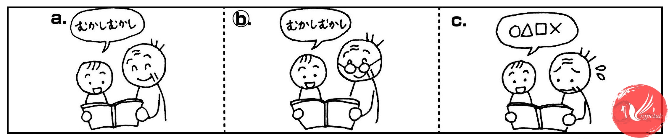 「む・か・し、む・か・し・あ・・・ろ? ら? おじちゃん、これ、何と 読むの? mu,ka,shi,mu,ma,shi,a…ro? ra? Ông ơi, cái này đọc sao vậy? |