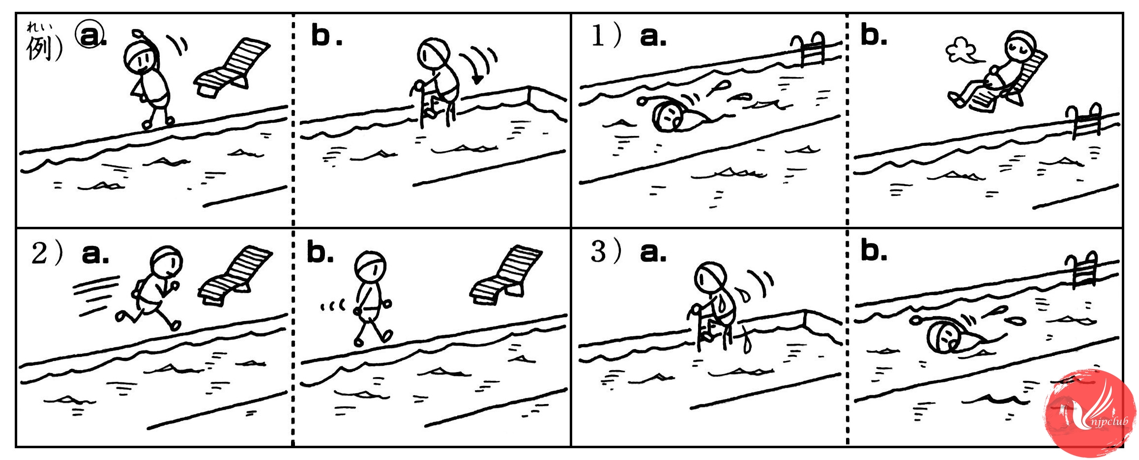 4. 男の 人は プールへ 行きました。注意を 聞いて、どうしますか。