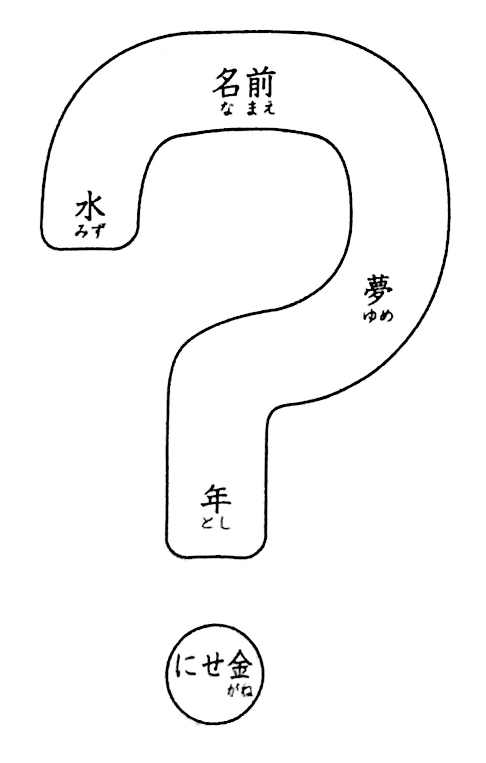 1. (みず)  2. 名前(なまえ)  3. にせ(がね)  4. (とし)  5. (ゆめ)