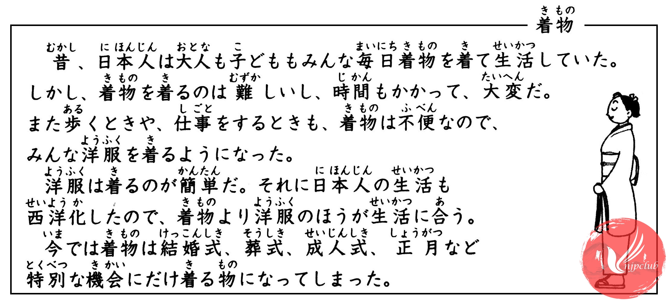 昔、日本人は 大人も 子どもも みんな 毎日 着物を 着て 生活して いた。 Ngày xưa, người Nhật thì cả người lớn cả trẻ con, ai cũng mặc kimono sinh hoạt mỗi ngày. しかし、着物を 着るのは 難しいし、時間も かかって、大変だ。 Nhưng việc mặc kimono vừa khó mà cũng mất thời gian nên rất vất vả. また 歩く ときや、仕事を する ときも、着物は 不便なので、みんな 洋服を 着る ように なった。 Hơn nữa, khi đi bộ hay khi làm việc thì kimono cũng bất tiện nên mọi người đã trở nên mặt âu phục. 洋服は 着るのが 簡単だ。