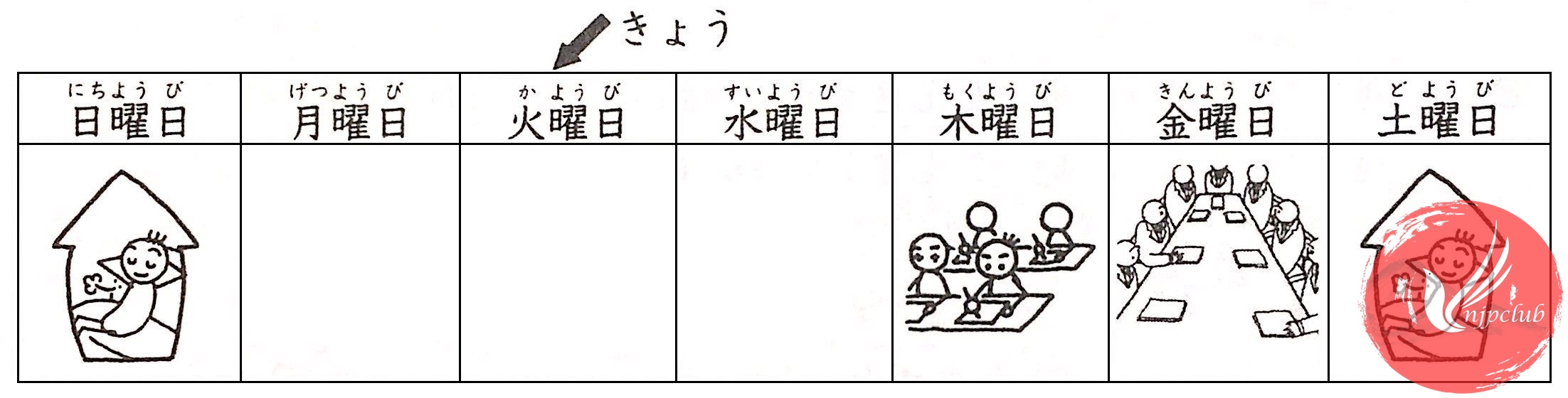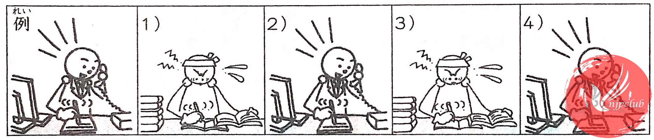 1)あした ⇒ 2)会議 ⇒ 3)試験 ⇒ 4)休み ⇒
