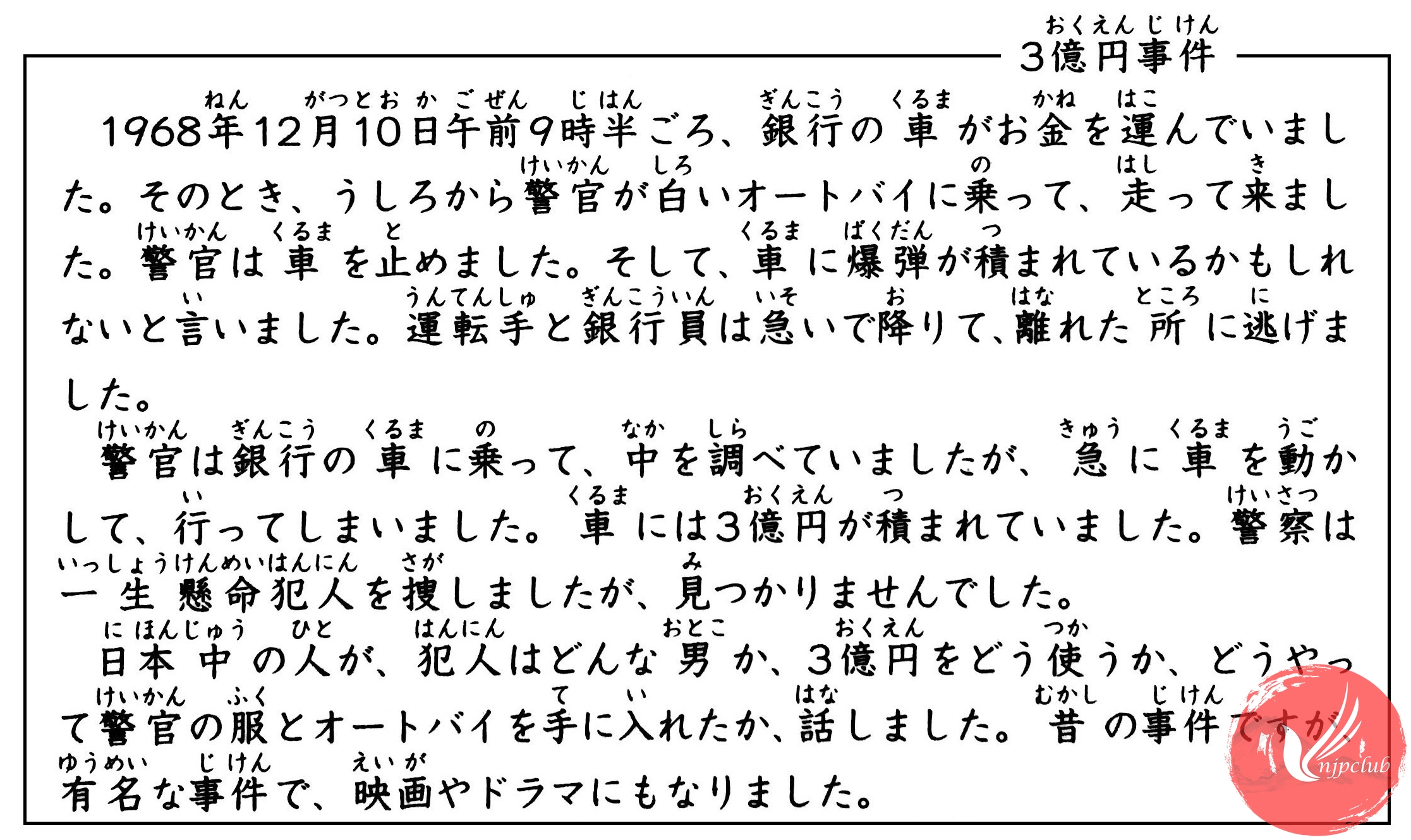 1968年12月10日 午前 9時半ごろ、銀行の 車が お金を 運んで いました。 Ngày 10 tháng 12 năm 1968 tầm 9 giờ rưỡi sáng, xe ngân hàng đang chở tiền. その とき、うしろから 警官が 白い オートバイに 乗って、走って 来ました。 Lúc đó, từ phía sau một cảnh sát viên leo lên xe autobike trắng, chạy đến. 警官は 車を 止めました。 Cảnh sát viên đã dừng xe lại. そして 車に 爆弾が 積まれて いるかも しれないと 言いました。 Và rồi đã nói là có thể xe đang chở thuốc nổ. 運転手と 銀行員は 急いで 降りて、離れた 所に 逃げました。 Người lái xe và nhân viên ngân hàng vội vàng xuống xe và chạy trốn vào nơi cách biệt.