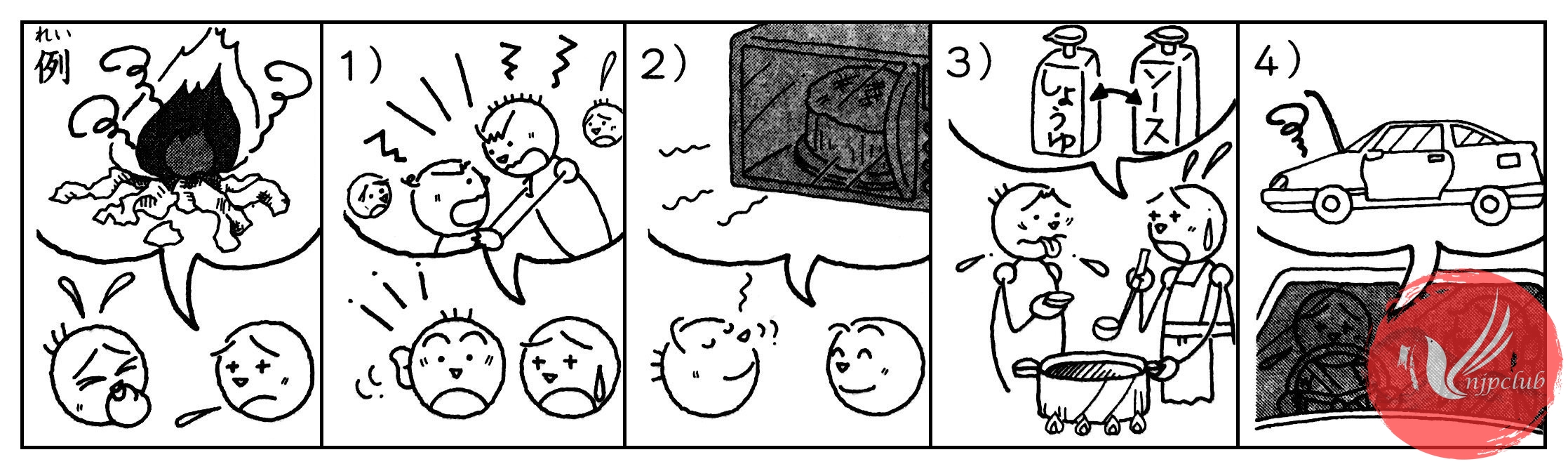 3)変な 味(しょうゆと ソースを まちがえました) ⇒