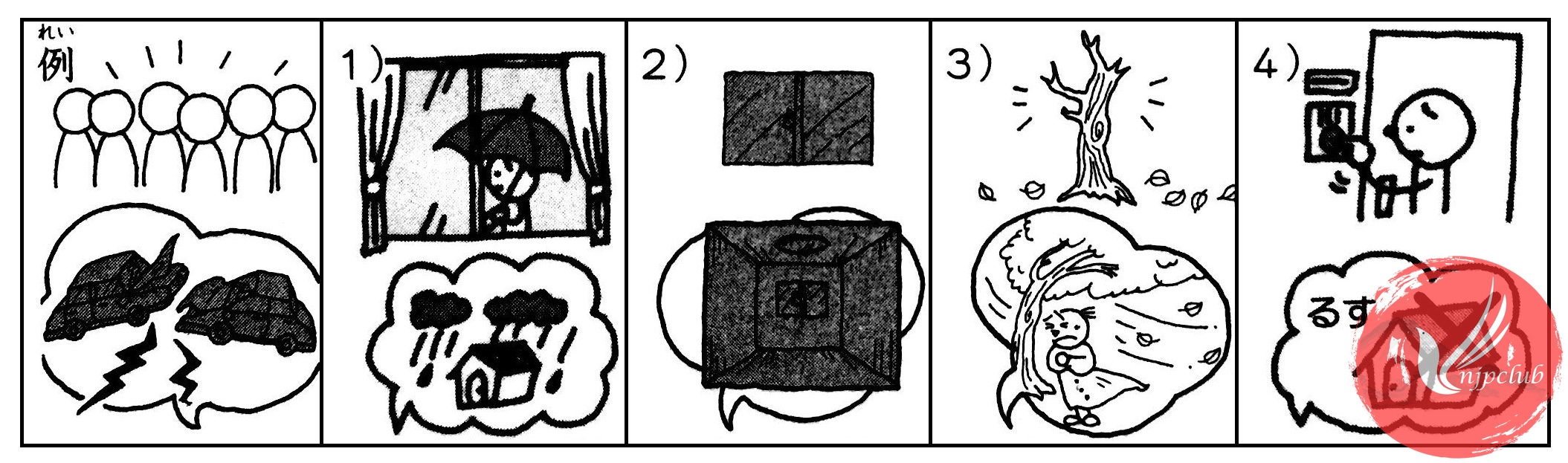 3)木の 葉が たくさん 落ちて いますね。(強い 風が 吹きました) ⇒
