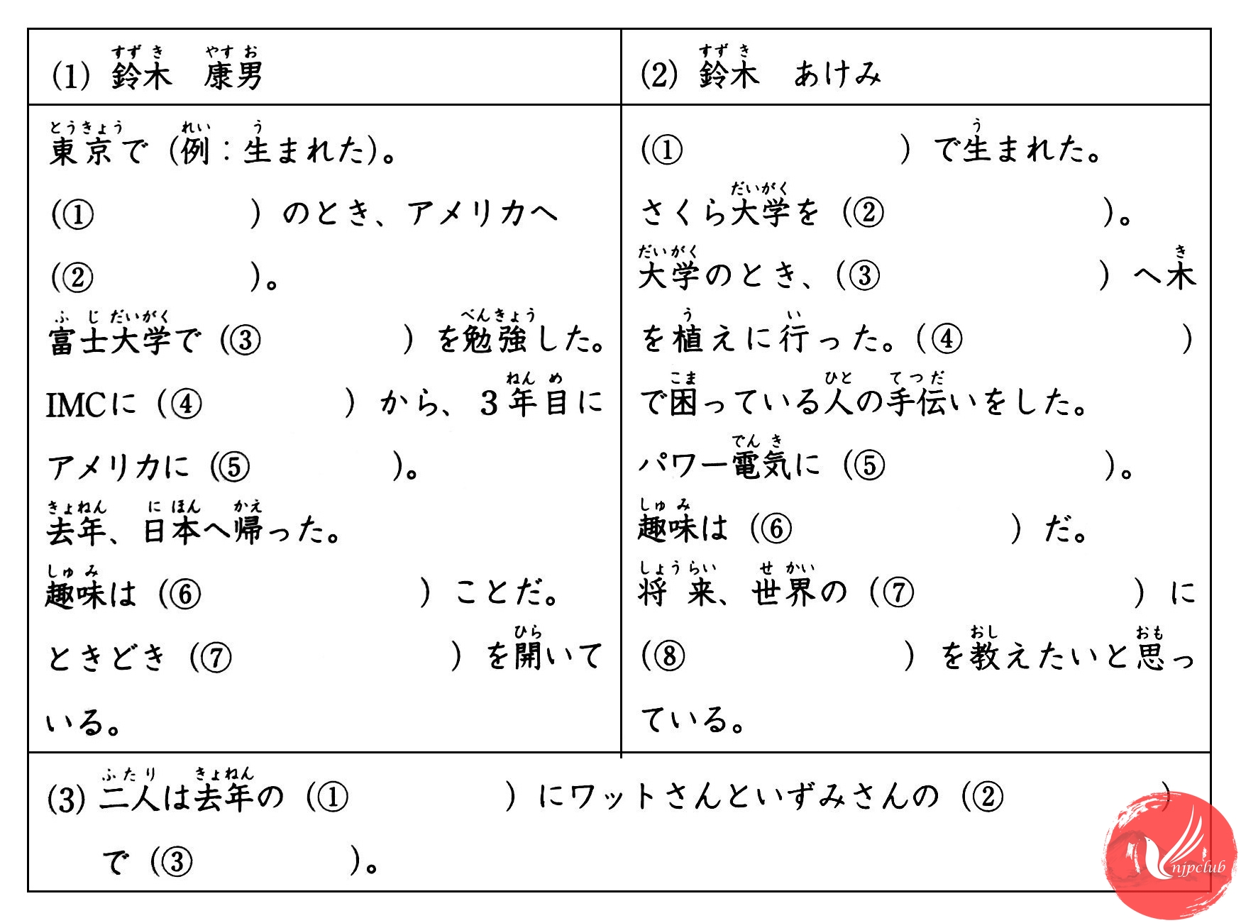 Đáp án (1) ①16歳 ②留学した/行った ③経済 ④入って ⑤転勤した ⑥ピアノを弾く ⑦(小さい)コンサート (2) ①京都 ②卒業した ③アジア ④地震や台風 ⑤勤めている ⑥スポーツ/柔道 ⑦子どもたち ⑧柔道 (3) ①11月 ②結婚式 ③知り合った/会った |
