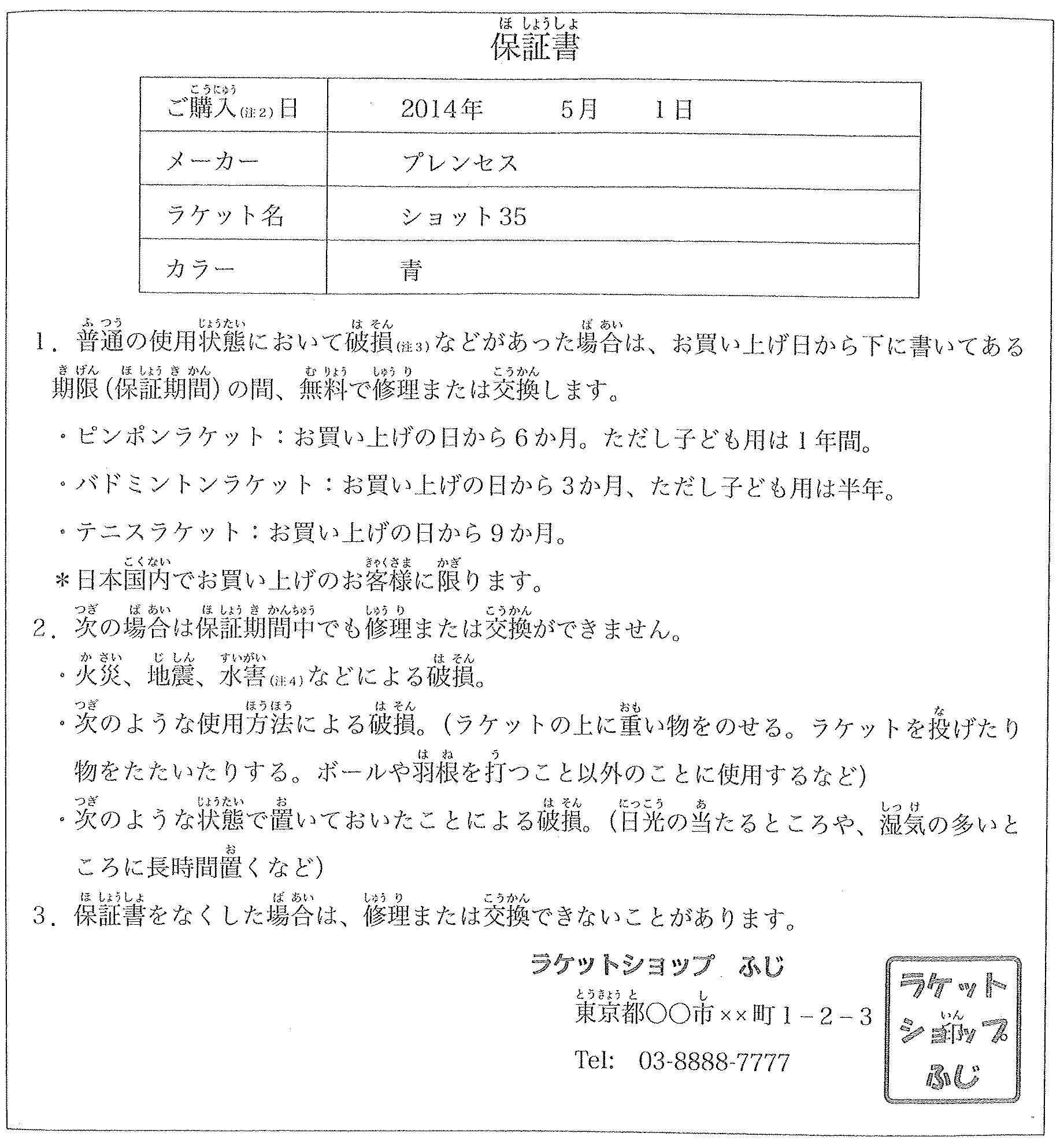 メイさんはテニスのラケットを買いにお店に行った。買ったとき、お店の人から、ラケットと一緒に下の保証書をもらった。
