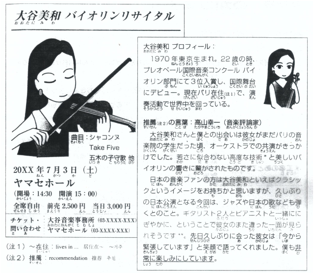 今度( こんど ) 、大谷( おおたに ) 美和( みわ ) のコンサート行( い ) かない?ギタリスト二人( ふたり ) とピアニストの4人( にん ) でやるんだって。