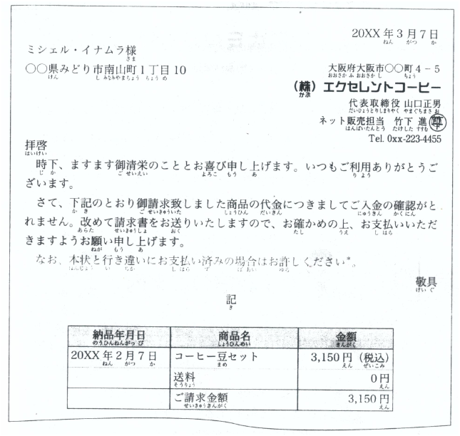 20XX年3月7日 ミシェル。イナムラ様 00県みどり市南山町1丁目10 大阪府大阪市〇〇町4-5 エクセレンコーヒー 代表取締役 山口正男 ネット販売担当 竹下 進 Tel. 0xx-223-4455