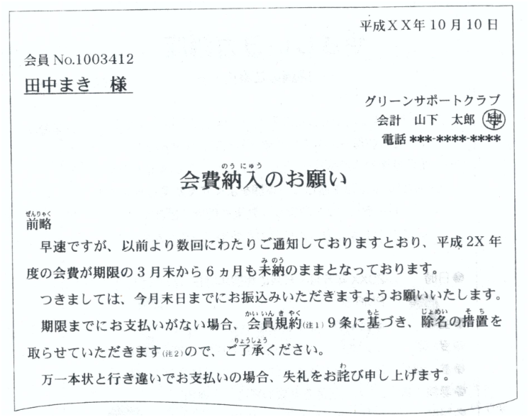 | 1. | 会費納入のお願いという通知は初めてきた。 |